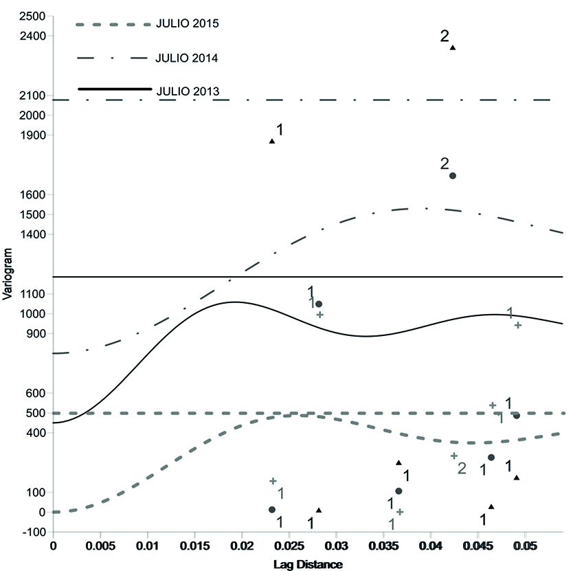 La Figura 6 compara los variogramas omnidireccionales para el mes de julio para los años 2013, 2014 y 2015. Al analizar los tres años se identificó que el rango (distancia) no cambia a pesar de que se modifique la formulación teórica del variograma. De esta forma puede introducirse un parámetro de forma denominado α que permite explicar la variabilidad espacial de las precipitaciones (ecuación 2). Esto es útil ya que, como se ha demostrado, la variabilidad espacial de las precipitaciones es función de la distancia en la que las mediciones son válidas, algo de lo que ya se tenía noción pero no en zonas urbanas (Sideris, Gabella, Erdin y Germann, 2013; Duan, Zheng, Li, Liu y Luo, 2017). Samper y Carrera (1996, p. 53), llaman a este efecto, efecto de proporcionalidad.