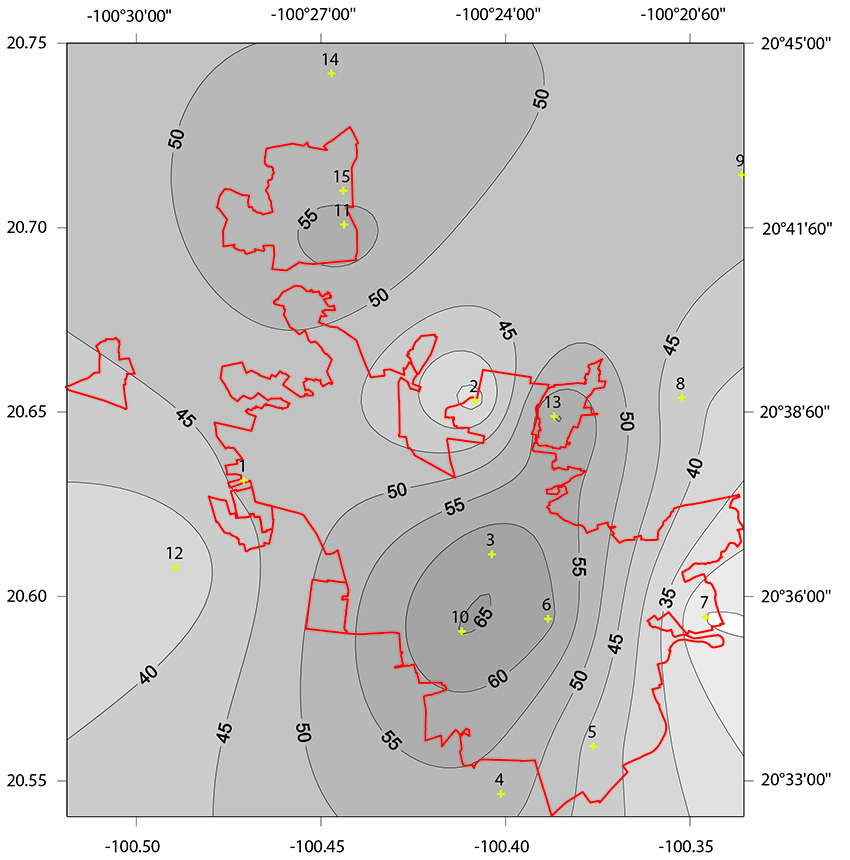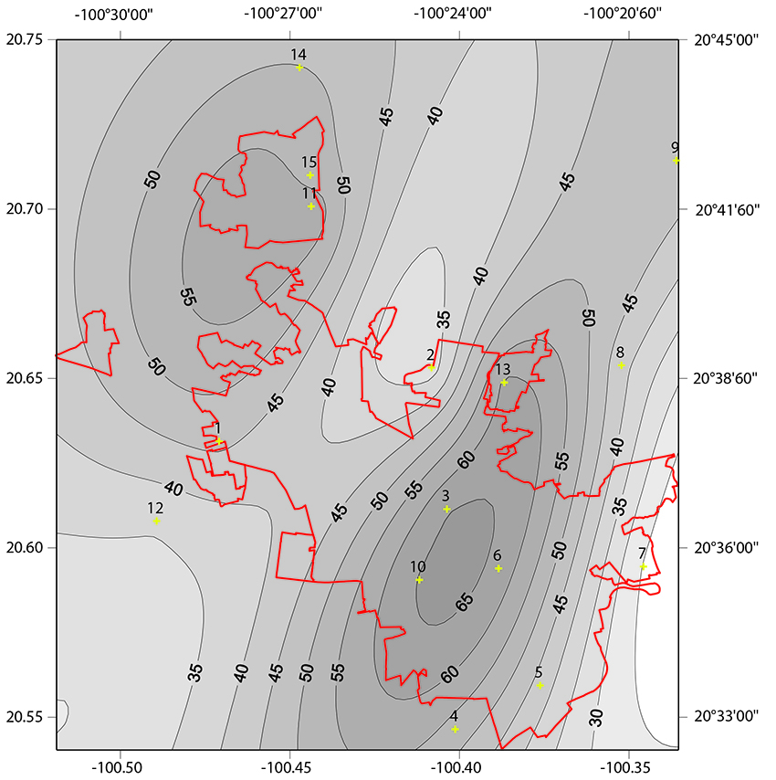 Resumen: La cartografía en hidrología es una de las formas tradicionales de representar la variabilidad espacial de eventos climáticos y ambientales. Sin embargo, pocas veces se pone atención a cómo se construyen, por ejemplo, los mapas de isoyetas. Una incorrecta selección del método de interpolación espacial puede ocasionar errores en la estimación de magnitudes. Se realiza una caracterización espacial y temporal de la variabilidad en la precipitación horaria de la zona metropolitana de Santiago de Querétaro. Se utilizan láminas de lluvia medidas a cada minuto de las diez tormentas más intensas registradas en los años 2013, 2014 y 2015. Utilizando variogramas direccionales, distancia entre estaciones y un esquema de anisotropía se obtienen los parámetros óptimos a emplear en una interpolación por Kriging. Los resultados muestran que en el mes de junio existe una mayor variabilidad de la precipitación en la zona metropolitana y que la lámina de precipitación tiene una correlación directa con la distancia entre estaciones. El análisis permite seleccionar de forma correcta los variogramas direccionales que deben emplearse para la interpolación espacial y la cartografía de campos de lluvia.