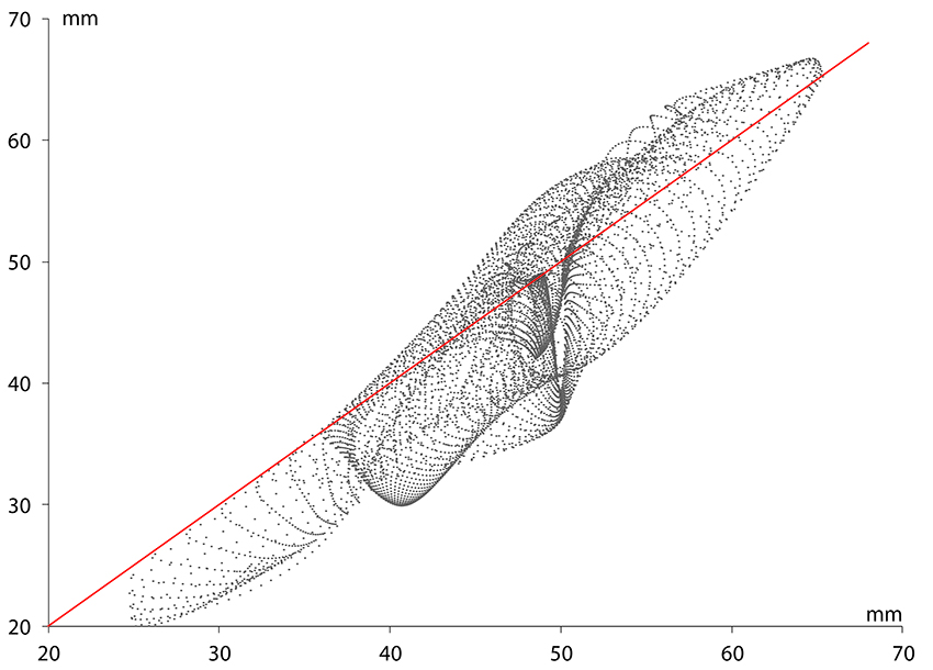 Finalmente, se utilizan estas formulaciones matemáticas anisotrópicas para representar las isoyetas de una tormenta similar a las realizadas por Tarawneh y Şen (2011) y Zhao et al., (2011). En este caso, se ejemplifica con las isoyetas de la tormenta del 18 de agosto de 2014, una tormenta severa que causó graves daños económicos y materiales en la zona metropolitana de la ciudad de Querétaro. Con este esquema de variabilidad se realizó la cartografía de las isoyetas de la tormenta de ese día; considerando una interpolación con Kriging tradicional (Figura 7) y una cartografía afectada por un variograma direccional y el parámetro α (Figura 8). Si se observan ambas cartografías no parecerían muy diferentes, sin embargo, cuando se trata de estimar eventos en tiempo real la precisión es de gran importancia (Kebaili-Bargaoui y Chebbi, 2009). Si se observan a detalle ambas figuras, el centro de la tormenta está desfasado, lo que representa al menos dos kilómetros de diferencia en distancia horizontal. Esta pequeña diferencia puede significar tres o cuatro cuadras y un centenar de casas afectadas por el centro de la tormenta. En la cartografía realizada con el Kriging tradicional (Figura 7) se observa un área de evolución mayor de la tormenta. Mientras que para la cartografía, tomando en cuenta la anisotropía (Figura 8), el sistema de tormenta se desarrolla en un área menor. Otro caso a mencionar es la zona de Santa Rosa Jáuregui, que para el primer caso se encuentra en una isoyeta de 50-55 mm, y tomando anisotropía, las autoridades verían una lámina de precipitación cercana a los 50 mm. Dados los protocolos de intervención de Protección Civil, estos 5 mm podrían significar intervenir o no. Para validar la metodología propuesta se realizó una validación cruzada con la estación del Centro Histórico, por ser la zona más atendida por las autoridades en época de lluvia. Se omitieron los registros de estación en la estimación de la interpolación de las mallas para generar la cartografía de las Figuras 7 y 8. El valor real de la precipitación medida en este sitio fue de 61.40 mm para la tormenta del 18 de agosto de 2014. Mientras que el valor estimado con la metodología propuesta resultó de 62.47 mm acumulado en 24 horas. Con el objeto de complementar esta validación cruzada, se calcularon 7800 puntos para generar una malla con la formulación propuesta de un variograma afectado por el parámetro alfa. Los resultados se muestran en la Figura 9.