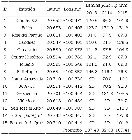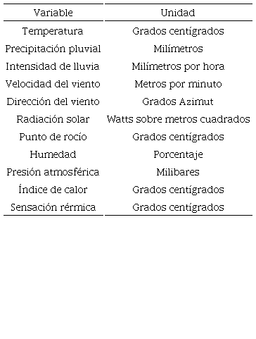 Por el contrario, el crecimiento de las zonas urbanas y el desmedido cambio de uso de suelo provocan un aumento en los volúmenes de escurrimiento superficial. Bajo estas condiciones se disminuye la capacidad de drenaje y los sistemas de desagüe colapsan. Se producen inundaciones, encharcamientos y caos vial en las zonas urbanas, donde no se cuenta con infraestructura adecuada ni con sistemas de alertamiento temprano que active protocolos para mitigar el riesgo de daño (Golian, Saghafian, Elmi y Maknoon, 2011; Gutiérrez, Vargas, Romero, Plácido de la Cruz, Aguirre y Silva, 2011). En la ciudad de Querétaro, en el centro de la república mexicana, se cuenta con una red de 40 estaciones, distribuidas en el territorio del estado, y casi 20 se concentran en la ciudad capital. La adquisición de información se realiza cada minuto y actualmente se cuenta con una base de más de 20 millones de datos adquiridos (Aguilar, Pastor, Vázquez e Ibarra, 2018; Gil, Ramírez, Muñoz y González, 2018). Esta red constituye uno de los sistemas más avanzados en Latinoamérica y el Caribe, pues además se han desarrollado más de 30 herramientas de hidro-informática que permiten realizar diversos análisis en tiempo real. La Tabla 1 muestra las variables climáticas que son monitoreadas por dicha red.