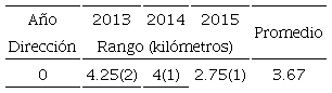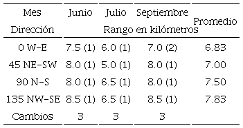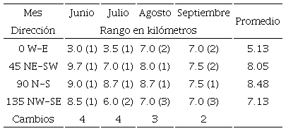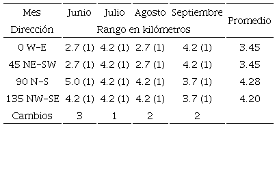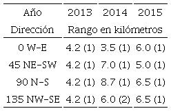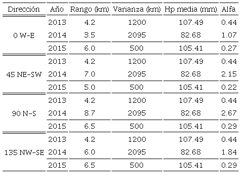 Con el objeto de observar el comportamiento espacial de la precipitación sobre la zona metropolitana de la ciudad de Querétaro y su zona peri-urbana, se utilizó información de los meses que presentaban mayor cantidad de lluvia y mayor cantidad de datos. Estos meses son junio, julio, agosto y septiembre, que constituyen los de mayor lluvia en el territorio mexicano. Con datos obtenidos de la red de monitoreo de precipitaciones extremas de la ciudad de Santiago de Querétaro (www.redciaq.uaq.mx), se seleccionaron los años 2013, 2014 y 2015 como representativos de las condiciones climáticas del estado. La Tabla 2 presenta la ubicación geográfica de estas estaciones. Con esta base de datos, de más de 20 millones de registros, se construyeron los variogramas experimentales para las direcciones propuestas en la Figura 2. El análisis geoestadístico de estos datos se encamina a encontrar las distancias a las cuales las mediciones empiezan a tener una variación tal que el valor medido es función de la distancia (h). La Tabla 3 muestra la variabilidad de la longitud máxima a la cual son válidas las mediciones de precipitación para el mes de junio, con dirección de 90° (N/S) y una tolerancia de 45°. El promedio de la dirección 90° (N/S) es mayor en comparación a las otras direcciones, lo cual indica que esta dirección de cinco kilómetros predomina en el año 2013. A partir de los cinco kilómetros las mediciones dejan de ser válidas y debe tenerse cuidado en utilizar valores fuera de este círculo de distancia (Rysman, Verrier, Lemaître y Moreau, 2013). De la misma forma, la Tabla 4 y la Figura 4 proporcionan una visión general para el año 2014; comparando los meses evaluados se obtiene que la máxima variabilidad en la distancia de validez de las mediciones es de nueve kilómetros y corresponde al mes de junio, con una dirección de 45° (NE/SW) y una tolerancia de 45°. La variación promedio de la dirección 90° (N/S) es mayor en comparación a las otras direcciones, por lo cual esta dirección predominó en el año 2014. Los resultados, para el año 2015, como se muestran en la Tabla 5 y la Figura 5, indican que la máxima variabilidad en la validez de la distancia de las mediciones se presenta en dos meses, junio y septiembre, con dirección de 135° (NW/SE) y una tolerancia de 45°.