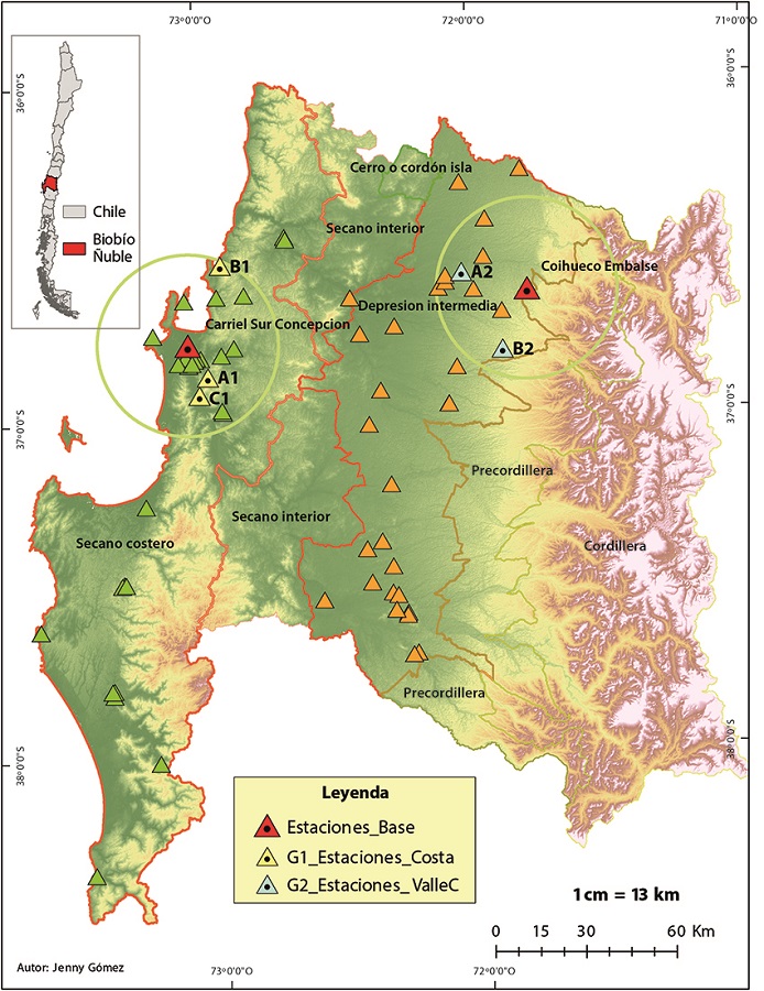 Los datos pluviométricos fueron seleccionados teniendo en cuenta criterios de homogeneidad en las precipitaciones basados en dos zonas ambientales de comparación diferenciadas por su morfología: la Zona Costera (G1) y el Valle Central (G2) (Figura 1). Estos datos corresponden a precipitaciones acumuladas mensuales de estaciones pluviométricas de la Dirección General de Aguas (DGA) y la Dirección Meteorológica de Chile (DMC), recopilados por el Centro de Ciencia del Clima y la Resiliencia (CR2), (CR2, 2016).