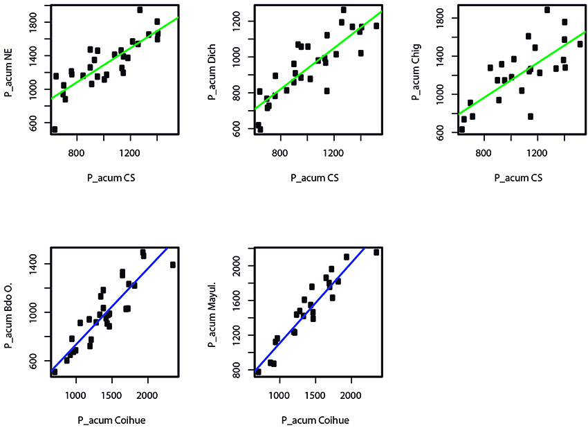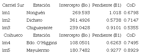 En la Figura 2 se observa que los puntos cubren equitativamente el rango de las estaciones base. Los valores altos de coeficiente de determinación representan, en general, un buen ajuste de las estimaciones a la variable real. Las rectas mínimocuadráticas muestran buen seguimiento de los datos, observándose, no obstante, un mayor rango de dispersión en los datos de Chiguayante. Para esta estación se obtiene el LRM con menor ajuste según el Coeficiente de determinación (CoD) y por tanto, el que tendría menor capacidad predictiva de la precipitación a pesar de tener un coeficiente de regresión cercano a 1.