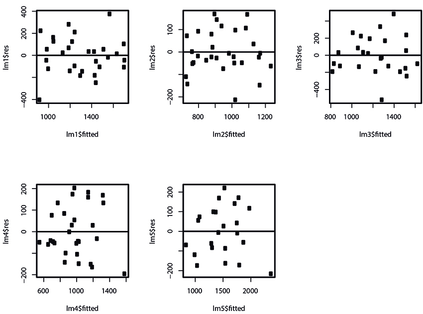 Se verificó la homogeneidad de los residuos con respecto a los valores observados en los modelos (Figura 3). Las gráficas a lo largo del eje x permiten verificar la homogeneidad de la variable y no revelan presencia de tendencias que planteen serias inquietudes con respecto a la homogeneidad en las varianzas de las variables, lo cual es indicativo también de independencia entre las predicciones ajustadas y sus residuos.