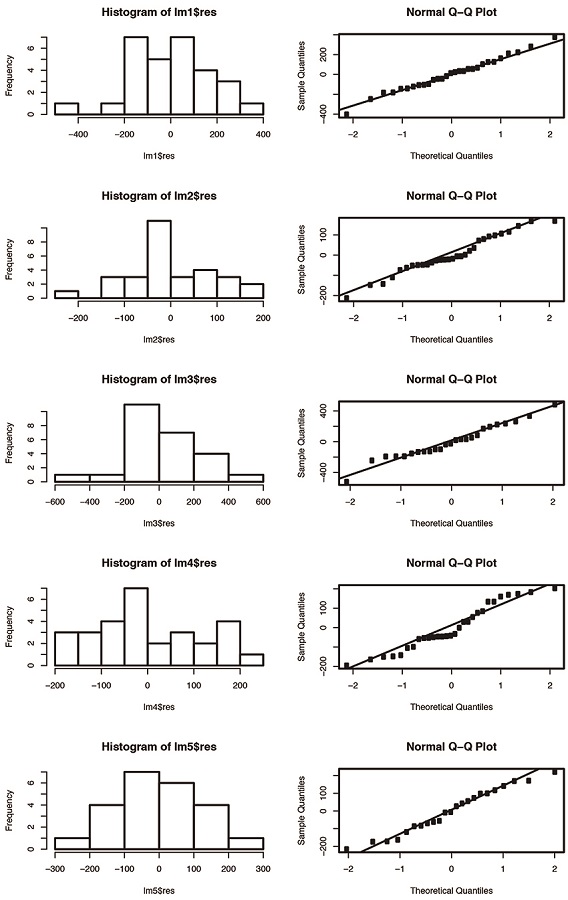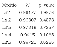 En la aplicación del modelo LRM se debe comprobar la consistencia de los modelos por medio de la verificación de algunos supuestos. En nuestro caso se tomó como supuesto la no colinealidad de las estimaciones y se comprobó la normalidad de los modelos. Para esto se aplicaron los métodos Q-Q plot que permite el análisis de probabilidad por cuartiles y el método Shapiro Wilk, igualmente se realizaron test para comprobar la homogeneidad de residuos.