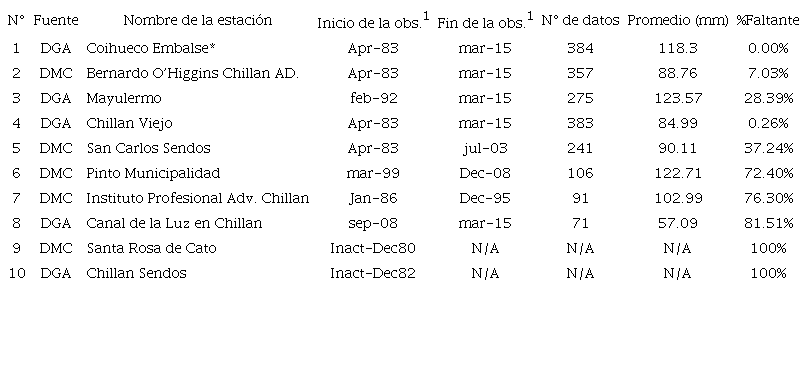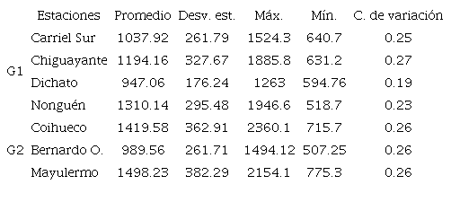 Las medias similares de las estaciones centrales Coihueco y Mayulermo, así como sus coeficientes de variación, revelan una gran similitud en el comportamiento de las precipitaciones.