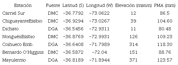 Usando dichas zonas como límites ambientales, se calcula una nueva base de datos de precipitación acumulada anual a partir de las estaciones pluviométricas en la planicie costera y valle central. Para este estudio, se contó con un universo de 112 estaciones en la Región del Biobío. El periodo de análisis se determinó por los años hidrológicos de precipitación acumulada anual comprendidos entre el 1º de abril de un año y el 31 de marzo del año siguiente, entre 1983 al 2015, para un total de 32 años empleados. En un primer filtro se descartaron las estaciones ubicadas fuera de las dos regiones morfoestructurales anteriormente definidas y aquellas que no se encontraran activas durante el periodo de estudio, y se obtuvo un total de 65 estaciones. Además, se usó un criterio de proximidad geográfica y una adaptación del método de análisis pluviométrico de dos o más estaciones, propuesto por Martínez de Azagra y Navarro (2007), para establecer la selección de estaciones en cada uno de los subgrupos, con centro en una estación base. Dicha estación se procura que tenga en lo posible un registro completo y que mantenga consistencia en los datos (Benitez, 1998). Las estaciones base seleccionadas para G1 y G2 se muestran en la Figura 1. Cada uno de los grupos corresponde a estaciones localizadas en un radio de 30 km de distancia de la estación base correspondiente. El listado de estaciones que cumplen estos criterios se presenta en los Cuadros 1 y 2.