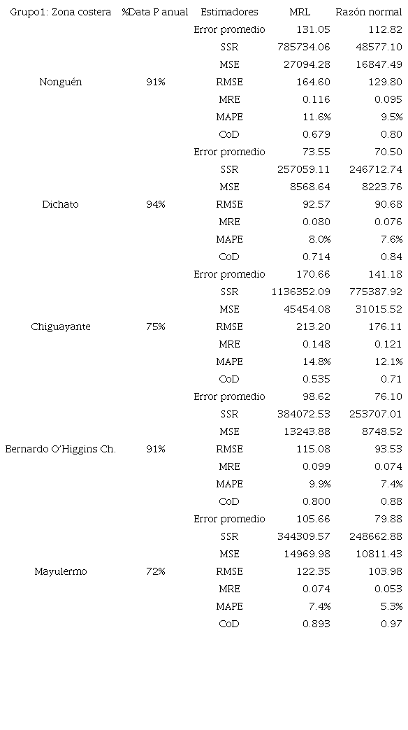 El estimador que da una idea del grado de aproximación media de los métodos al valor real de la precipitación, independientemente de las unidades, es el error relativo medio (MRE) y el error porcentual absoluto medio (MAPE), el cual también ratifica un mejor comportamiento de razón normal frente a la regresión para ambos grupos (G1 y G2) y un menor error de estimación entre ambos grupos en la estación Mayulermo del valle central.