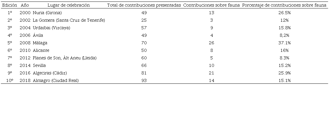 En el contexto español se han llevado a cabo diversos estudios de zoogeografía durante las dos últimas décadas. Destacan trabajos como los desarrollados por Longares, Lozano Valencia y Rubio Recio (1998) o por Lozano y Meaza (2003a, 2003b) -estos últimos sobre valoración zoogeográfica por unidades ambientales-. Sirva también como ejemplo la publicación en 2012 del número monográfico de la revista Polígonos sobre “Trabajos de Zoogeografía en España” (Polígonos. Revista de Geografía, 2012, 22). Sin embargo, se trata de una rama que aún continúa siendo minoritaria, tal y como pone de manifiesto la escasa proporción de contribuciones sobre fauna en los diez congresos nacionales de biogeografía celebrados hasta la fecha (Cuadro 1).