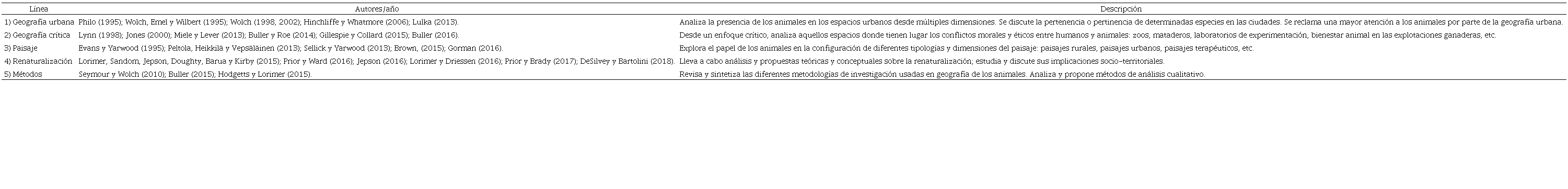 No obstante, la revisión y análisis de la bibliografía surgida durante las dos últimas décadas ha permitido la identificación de diversas áreas de investigación en relación con esta corriente. Entre las líneas más relevantes, cabe destacar los estudios desarrollados en convergencia con la geografía urbana, la geografía crítica y la ciencia del paisaje, siendo igualmente significativas las publicaciones sobre renaturalización o aquellas otras de carácter metodológico. En el Cuadro 2 se presenta una síntesis de estas cinco grandes líneas de investigación en geografía de los animales.
