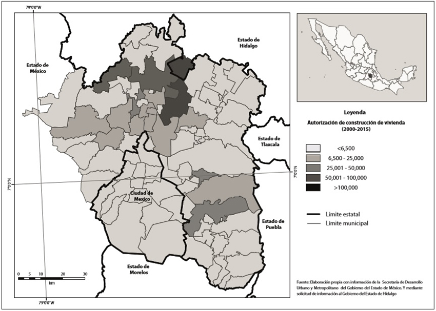 La ZMVM (Figura 1) presenta una creciente actividad del mercado formal de vivienda en la última década, diferenciándose en dos sentidos: en las áreas centrales, tanto por las políticas federales ya señaladas como por las políticas locales, tal como sucedió con el Bando 2, que favoreció la construcción de vivienda destinada para sectores de población de ingresos medios y medios-altos (Benlliure, 2008); mientras que en el norte y oriente de la periferia urbana se destinó para la construcción de conjuntos habitacionales para población de bajos ingresos, debido a que el precio del suelo es más barato respecto a los municipios y alcaldías del centro de la ciudad.