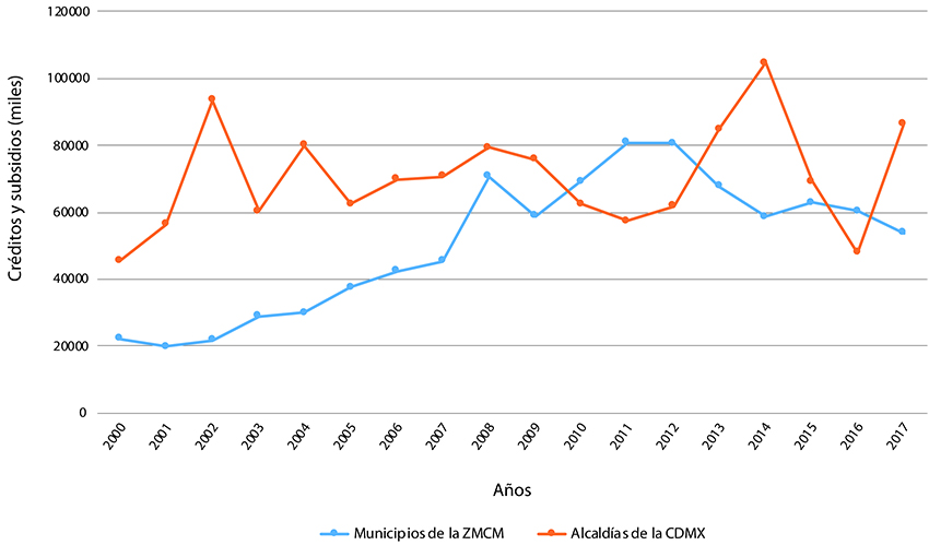 A partir del 2009, la valorización de la vivienda ha venido de la mano de otros tipos de financiamiento, no así de la construcción de vivienda nueva, siendo muy relevantes los de mejoramientos a la vivienda y los de vivienda usada, lo que pone en eidencia que, en la medida que disminuyen los subsidios para vivienda nueva, se acrecientan los demás. En las alcaldías de CDMX es notoria la prioridad puesta en los mejoramientos, que desde el 2013-2017 superan cualquier otro tipo de créditos y subsidios. De igual manera, para los municipios de la ZMVM, este ítem aumenta con la crisis de la vivienda nueva y, de manera paulatina, va posicionándose en la medida que la vivienda nueva decrece, hasta llegar a tener mayor presencia que esta en 2015 y 2017.