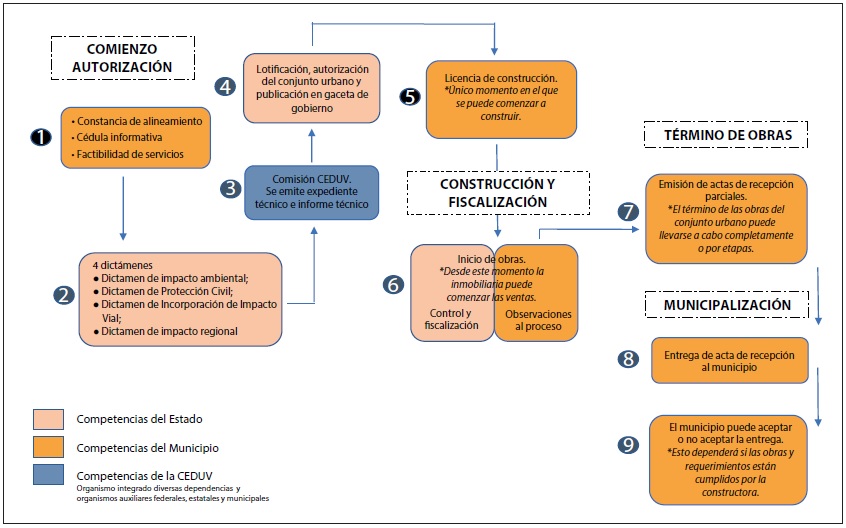 La producción de vivienda en conjuntos habitacionales se lleva a cabo mediante un proceso en el cual se ven involucrados, por una parte, el sector inmobiliario y, por otro, funcionarios del gobierno municipal y del gobierno estatal. El proceso de autorización de conjuntos habitacionales (Figura 4) se apega a un marco normativo que regula los permisos necesarios, cuyo cumplimiento puede llegar a demorar cerca de un año (en caso de no repetir algún estudio de factibilidad requerido); sin embargo, según los “acuerdos” generados entre desarrolladores y funcionarios públicos, este tiempo puede llegar a tener una duración de tres meses, cuando el periodo reglamentario se encuentra entre uno a dos años. Esta situación representa una gran problemática y un desafío para la política de vivienda desde una escala local. A continuación, a partir de un extracto de una entrevista, podemos identificar distintos eventos y actores que intervienen en contradicciones y desapegos a la normativa. De manera particula, a los acuerdos entre desarrolladores y autoridades municipales: