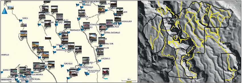 Los recorridos se alternaron por las veredas y a través de las fincas, y se asistieron con un sistema de posicionamiento global (GPS) Garmin Etrex20® (Figura 3, derecha) y una cámara Garmin Virb Elite® que proporciona fotografías con georreferencia (Figura 3, izquierda).