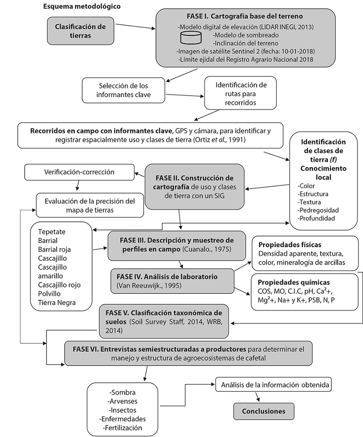 Por otra parte, de acuerdo con Barrera-Bassols y Zinck (2002), el enfoque etnoedafológico integra el conocimiento de los campesinos y el conocimiento técnico por medio de disciplinas como la geografía, edafología, agronomía, agroecología, antropología social y etnoecología para la clasificación, cartografía y manejo de tierras. Como parte de este enfoque, Ortiz-Solorio et al. (1991) realizan primero una clasificación campesina de tierras con los productores de la zona y, posteriormente, la complementan con una clasificación taxonómica (Soil Survey Staff, 2014; IUSS Working Group WRB, 2014).
