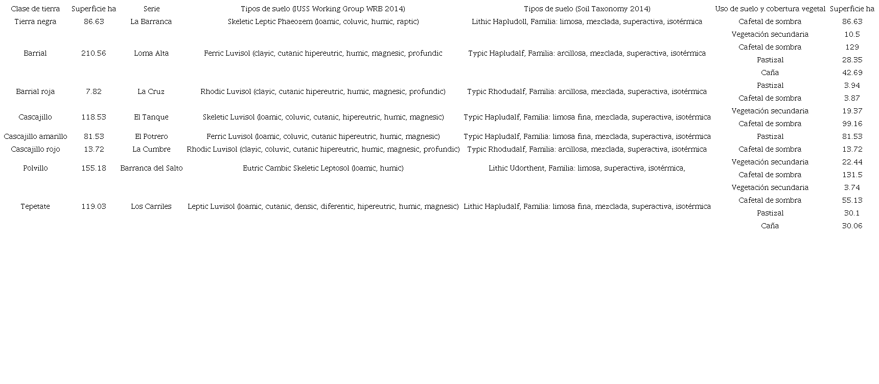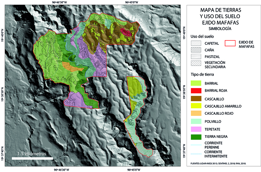 Con respecto al patrón de uso y cobertura de las tierras en el ejido Mafafas, se identificaron cuatro categorías predominantes (Cuadro 3): cafetal, vegetación secundaria, pastizal y cañaveral, los cuales ocupan el 65.5%, 7.1%, 18.2% y 9.2% del territorio ejidal, respectivamente; las asociaciones de suelo y vegetación ayudaron a mejorar el mapa de tierras, debido a que los productores mencionan que el Cascajillo amarillo es común de pastizales y el Cascajillo se encuentra donde hay cafetal con sombra, esto ayudó a dividir la clase Cascajillo entre dos unidades distintas.