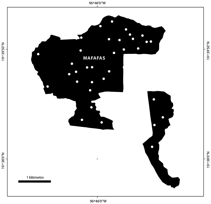 El estudio se realizó en la localidad de Mafafas, un ejido cafetalero del municipio de Tepetlán, ubicado en el centro del estado de Veracruz (Figura 1). El núcleo poblacional se encuentra en la coordenada central 19.65° de latitud este y de -96.75° de longitud oeste, a una altitud entre 1300 y 1500 msnm El basamento geológico está constituido predominantemente por depósitos de origen volcánico, de acuerdo con el Servicio Geológico Mexicano (2002), y consiste en brecha volcánica dacítica y toba andesítica. Según INEGI, el clima es semicálido húmedo con temperatura media anual entre 18° C y 22° C, con una precipitación anual entre 2000 y 3000 mm.