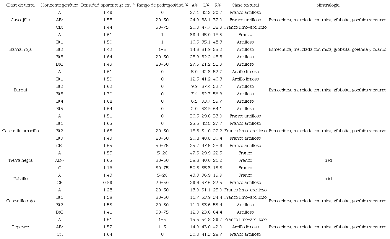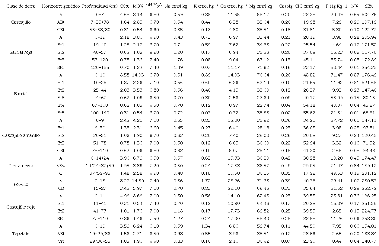 Posteriormente, se realizaron perfiles edafológicos en cada clase identificada. En los Cuadros 1 y 2 se presentan los resultados de las propiedades químicas y físicas, insumos necesarios para la clasificación taxonómica, que fueron determinadas en el laboratorio de génesis y clasificación de suelos del Colegio de Postgraduados.