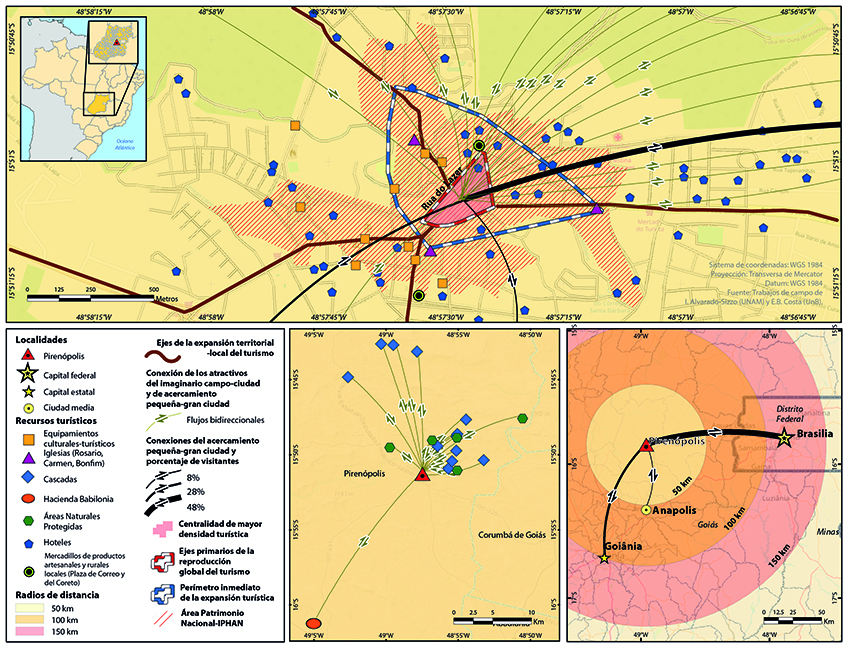 La declaratoria es el evento que define el espacio-tiempo de la intensificación del turismo en Pirenópolis. Las décadas de incremento de esa práctica, a partir de 1990, produjeron lo que fue identificado en trabajos de campo y propuesto como situación geográfica turística; noción aquí definida como palimpsesto de escalas territoriales superpuestas que revela la conexión de ideas, de imágenes, de experiencias, de capitales y de objetos técnicos geográficos, para el desarrollo de la actividad o fenómeno. Será presentada la propuesta metodológica en que tales escalas y conexiones son traslapadas cartográficamente, representando la potencia histórica de lo rural y de las ruralidades para generar una situación espacial mediada por pequeñas, medias y grandes ciudades.