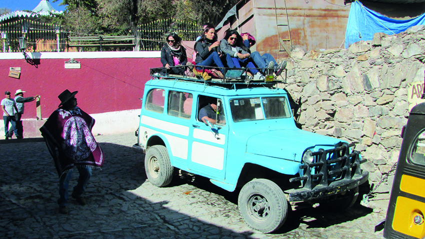 3. A lo largo del año, fuera de los períodos vacacionales, festivos o fines de semana, los días y las noches en el pueblo son de poca movilidad. La mayor dinámica está en esa L, que contiene tres puntos de lanzadera (la explanada fuera del Túnel, la Plaza de Armas y la calle Allende), donde los turistas (y peregrinos) contratan paseos para explorar los alrededores (o intentan adquirir lo real rural), operando la conexión de los atractivos del imaginario campo-ciudad y del acercamiento pequeña-gran ciudad. Los recorridos se hacen a pie o caballo, acompañándose por uno de los cerca de 100 caballerangos (ex mineros o campesinos incorporados al servicio turístico, Figura 9), que trabajan como guías y cuentan con alrededor de 250 equinos.48 Una virtualización de lo rural que también ocurre cuando se contrata un viaje a bordo de un “willy” -vehículo Jeep de la década de 1960-49 para visitar las ruinas de la ex hacienda minera (Pueblo Fantasma), la antigua estación de tren (Estación Catorce), rutas por la sierra (Altiplano Potosino) y el desierto para llegar a Wirikuta, la zona sagrada de los indígenas wixaricas [huicholes] (Figura 10). Muchos turistas son movidos por el interés de conocer el peyote, cactus endémico (Lophophora williamsii) al que se le atribuyen efectos alucinógenos, así como por el misticismo que rodea al sitio religioso de origen prehispánico. H. Capel comenta que los turistas y los visitantes tienden a interesarse por aspectos diversos e inesperados, descubren a veces a la misma población rasgos que esta no ha valorado (paisaje, estructuras geológicas, ambiente urbano, convivencia, estructuras industriales del pasado etc.). Por ello, “… se han de tener en cuenta las relaciones organizadoras de la ciudad con el espacio circundante, con sus áreas de influencia, con los espacios rurales. De manera general, es conveniente pensar en la ciudad y en su comarca, para desarrollar a ambas a través de visitas, turismo rural, valoración de equipamientos y riqueza naturales o agrícolas” (Capel, 2009, p. 27).