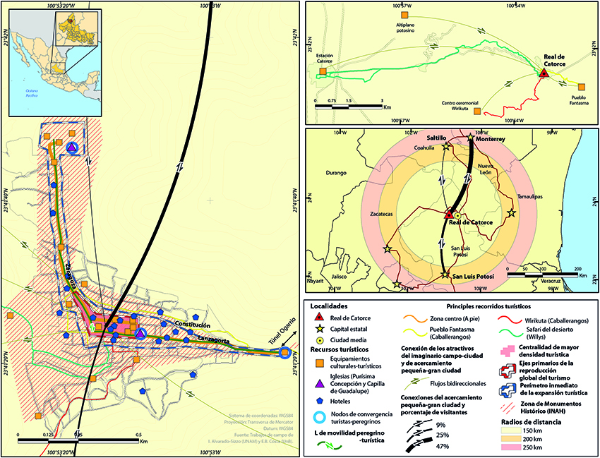 Al igual que Pirenópolis, Real de Catorce revela una situación geográfica turística cuya esencia contiene el campo y las ruralidades conectoras de pequeñas y grandes ciudades. La investigación de campo en Real de Catorce y la Figura 7 derivado presentan una situación geográfica turística (o la interacción-totalización de múltiples escalas y temporalidades de lo rural-urbano) en México, de la siguiente manera: