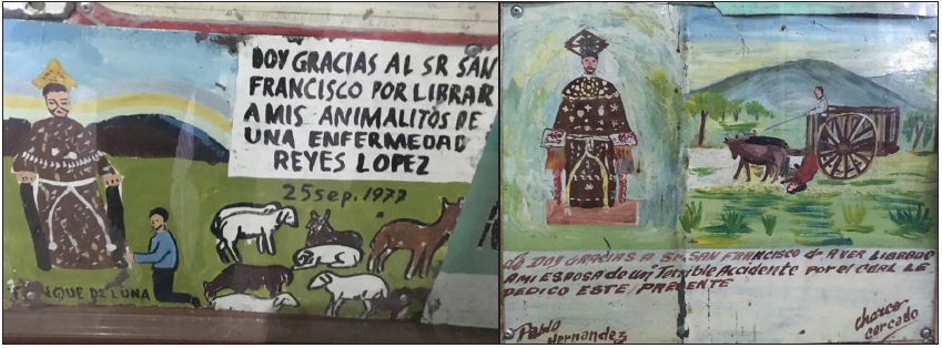 1. Real de Catorce concentra 39 establecimientos de hospedaje y una llegada anual de 38 109 turistas -80% de origen nacional- (Inegi, 2017). Actualmente, los visitantes atraídos por el imaginario agreste rural del lugar se mezclan con los peregrinos devotos de San Francisco de Asís,44 imagen situada en la Parroquia de la Purísima y que, desde el siglo XVIII, ha atraído fieles. Los peregrinos tienen motivaciones y comportamientos distintos a los turistas, pues, aunque representan una afluencia importante,45 no suelen pernoctar.46 Los exvotos dedicados al santo, exhibidos por miles, en la Parroquia de la Purísima (Figura 8), representan milagros asociados con la sanación de enfermedades, ayuda en accidentes sufridos por los mineros, así como la resolución de problemas de la vida en el campo (curación de animales, rescate de cosechas, etc.). Es reveladora la composición visual de los exvotos: incluye el paisaje ruralizado de Real de Catorce y la cosmogonía del campo mexicano. El eje L de movilidad peregrino-turística, que contiene las calles Lanzagorta y Libertad [ruta que conecta el Túnel Ogarrio47 y la capilla de Guadalupe] representa el territorio apropiado y usado en el contexto de las tradiciones sacro-urbano-rurales y sus eventos decurrentes; marca los desplazamientos peregrino-turísticos, concentra los principales equipamientos, atractivos y comercio turísticos en el área localizada entre la Parroquia de la Purísima y la Plaza de Armas.