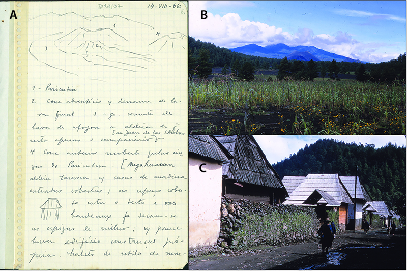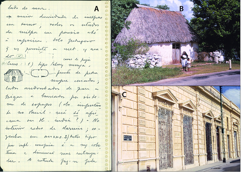 A corto plazo, México permitiría confirmar y ampliar la representación articulada que Orlando Ribeiro ensayó entre las varias partes del mundo tropical que tomaba de referencia. De hecho, después del artículo de Finisterra de 1967, el México que conoció en 1966 continuará resonando en su obra, desde luego, en diversos estudios acerca de temas urbanos en los cuales discutió una tipología para las ciudades de matriz ibérica (Ribeiro, 2014, pp. 519, 524, 533, 546, 573). Lo mismo sucedió con el libro La zone intertropical humide, escrito con la colaboración con Suzanne Daveau, como vimos, y que aparece ilustrado con seis fotografías acopiadas en el transcurso del viaje que hicieron: de los templos de Palenque, la asociación de cultivos agrícolas en un terreno de Uruapan, la tipología de casa en el pueblo de Angahuan, la apariencia “musulmana” de las azoteas de Guanajuato, la fachada plateresca de la catedral de México y los edificios modernos del Paseo de la Reforma (Daveau y Ribeiro, 1973). Junto a estas fotografías reencontramos en La zone intertropical humide consideraciones familiares del “complejo simbiótico” de la agricultura tradicional, explicado por Carl Sauer en Agricultural Origins and Dispersals (1952), acerca de la notable geometría de Teotihuacan, la relación entre la dispersión y los contingentes poblacionales de la zona maya y la importancia de la milpa en el respectivo sistema agrícola, discutido por Pierre Gourou, y también las alteraciones en el estatuto jurídico y la dimensión de la propiedad resultantes de la reforma agraria mexicana explicadas y cartografiadas por Claude Bataillon en “Note sur les paysages agraires du Mexique central” (1967) (Davea y Ribeiro, 1973, pp. 86-91, 125-126, 194-196; Bataillon, 1967, pp. 37-48; 2008, pp. 53-59, 77-87). Gracias al cuaderno de campo de México, así como el levantamiento fotográfico que el geógrafo portugués realizó a lo largo de sus itinerarios por este país, tenemos acceso a la generalidad de las fuentes primarias que constituyen la base para las reflexiones que después dejó en toda esa serie de textos.