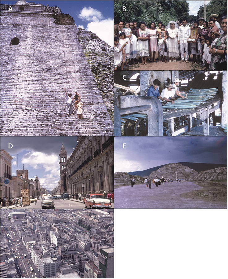 Estos presupuestos son válidos tanto para el contexto en que transcurrió la excursión a México central y las pequeñas excursiones organizadas por la CRLA en el área metropolitana de la Ciudad de México y Teotihuacan, así como la ruta maya mexicana y el desplazamiento a Veracruz. Estos últimos derroteros articulados en torno a Yucatán ya no constaban en las actividades programadas en el ámbito del evento regional de la UGI y seguían los principales itinerarios turísticos establecidos en la región (Kish, 1967, p. 2; Helfritz, 1971 [1968], pp. 79-159). Por indicación de Suzanne Daveau y el contenido de una carta de Orlando Ribeiro cuya copia está guardada en el Arquivo Antigo del Centro de Estudos Geográficos de la Universidade de Lisboa, sabemos que éstos correspondieron a una excursión particular organizada por el geógrafo brasileño Hilgard O’Reilly Sternberg, que en 1964 se transferiría a la University of California en Berkeley (Carta de Orlando Ribeiro a Hilgard O’Reilly Sternberg, Lisboa, 6.X.1966, AA-CEG; Kohlhepp, 2015, pp. 43-47; Kohlhepp, 2017, pp. 11-12). Por lo demás, Sternberg es el autor de una de las dos únicas fotografías de este viaje a México existentes en la Fototeca del Centro de Estudos Geográficos de la Universidade de Lisboa, en la cual se registró una imagen del propio Orlando Ribeiro, en este caso, en compañía de las mujeres de ambos, Suzanne Daveau y Carolina da Silveira Lobo Sternberg, ella también geógrafa.