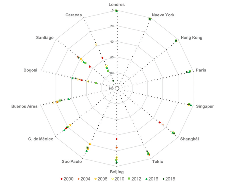 Respecto a las otras tres ciudades seleccionadas en el ámbito latinoamericano, se aprecia claramente que están muy lejos del rango de ciudades globales y ocupan el escalón tercero, e incluso el cuarto, de la jerarquía. Bogotá y sobre todo Santiago manifiestan, no obstante, una tendencia ascendente, mientras que Caracas, por el contrario, se muestra regresiva en concordancia con la grave crisis que castiga al país.