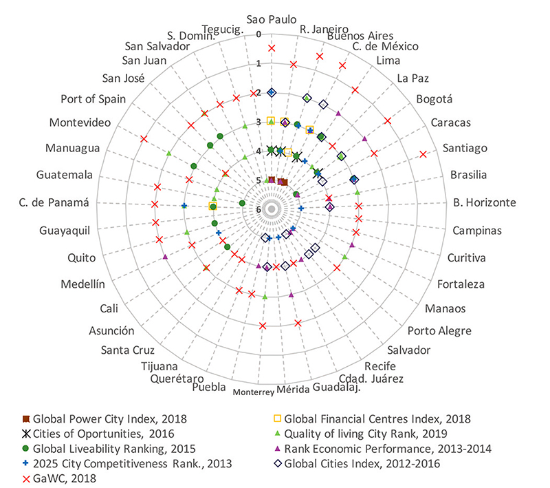 Además de la clasificación del GaWC y con objeto de matizar el rango de Ciudad de México, extrajimos información de otras ocho propuestas, seleccionadas por su significado y por el prestigio de las entidades que las elaboran (consultoras y agencias de ámbito mundial como PWC, Mercer, ATKearney, The Mori Memorial Foundation, The Econmist-Intelligence Unit). Aunque no es cuestión de tratar la valoración de los resultados o los criterios de elaboración, queremos destacar estos listados que tienen diversos enfoques y han requerido importantes logísticas para obtener datos y tratar de expresar perspectivas multidimensionales. El número total de ciudades latinoamericanas que aparecen en el total de estos estudios es de 41: los centros económicos de las dos grandes potencias macroregionales, Sao Paulo y Ciudad de México; metrópolis importantes como Buenos Aires, Bogotá, Lima, Santiago, Río de Janeiro y Caracas, y todo un cortejo formado por las capitales de países más pequeños, así como un número significativo de ciudades grandes y medias, tanto de Brasil como de México.
