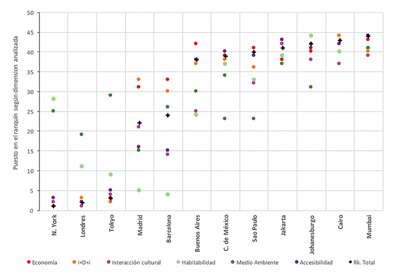 Aunque se podría objetar que este listado contempla un número muy reducido de localizaciones (solamente 44), en su mayoría situadas en países desarrollados, y que las ciudades de Latinoamérica y África ocupan lógicamente peores posiciones, lo que interesa aquí no es tanto valorar el orden final en cuanto a la comparación intrínseca de las dimensiones. Ello permite observar que las ciudades que destacan por su desempeño económico (Nueva York, Londres, Tokio) tienen indicadores deficientes en medio ambiente y habitabilidad. Otras ciudades con rango intermedio, como Madrid y Barcelona, muestran una importante disimilitud entre las seis dimensiones consideradas, y son los aspectos de habitabilidad los que mejor las posicionan.
