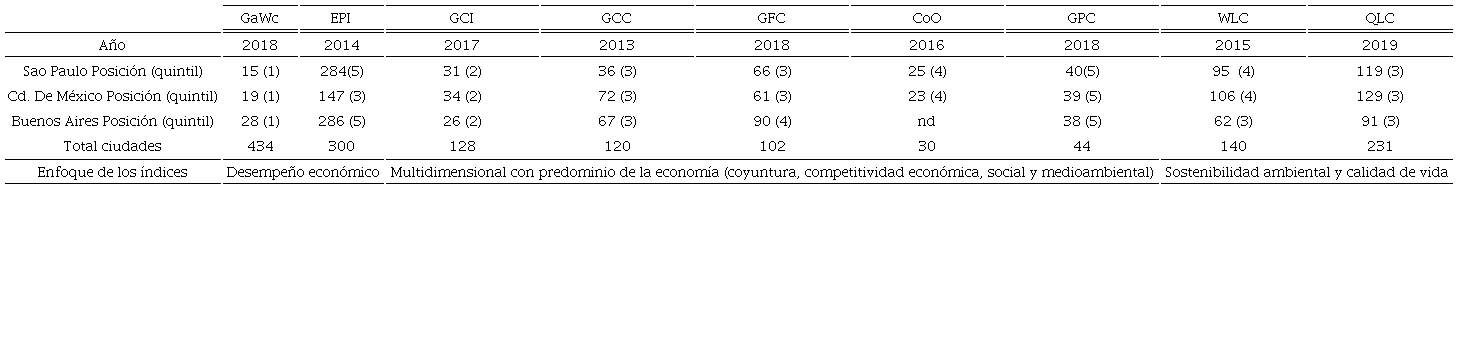Los resultados de la posición de Ciudad de México en cada uno de estos listados se recogen en la Tabla 1, en la que se expresan también los resultados de las otras dos grandes metrópolis latinoamericanas, Sao Paulo y Buenos Aires.