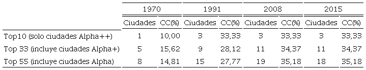 El coeficiente de conexión internacional (CC) de Ciudad de México se ha incrementado considerablemente desde 1970, pero no expresa durante este siglo el dinamismo que se podría esperar de una ciudad de rango mundial. Respecto al top 10 de la lista del GaWC, Ciudad de México tenía en 1970 conexión directa con Nueva York y en los noventa también con Londres y París, lo que le proporcionaba un CC de 33.33% en este rango, valor que permanece inalterado en 2015. Respecto al top 33 que define el segundo rango de ciudades dominantes del GaWC y en el que, recordemos, ya se integra la propia Ciudad de México, el CC de esta ciudad se ha incrementado de 15.62% en 1970 a 34.37% en 2008, y permanece inalterado desde entonces, evidenciando un grado de interrelación moderado y estabilizado. Otro tanto ocurre en las relaciones con el top 55 (tres escalones superiores), donde el CC de Ciudad de México sube de 14.81% en 1970 a 35.18% en 2008, estancándose también en ese momento (Tabla 2).