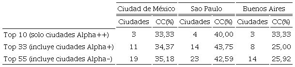 Comparativamente, se puede señalar, por otro lado, que Ciudad de México tenía en 2015 unos coeficientes de conexión inferiores a los de Sao Paulo pero bastante superiores a los de Buenos Aires, las otras ciudades latinoamericanas que comparten con ella rango en el GaWC (Tabla 3).