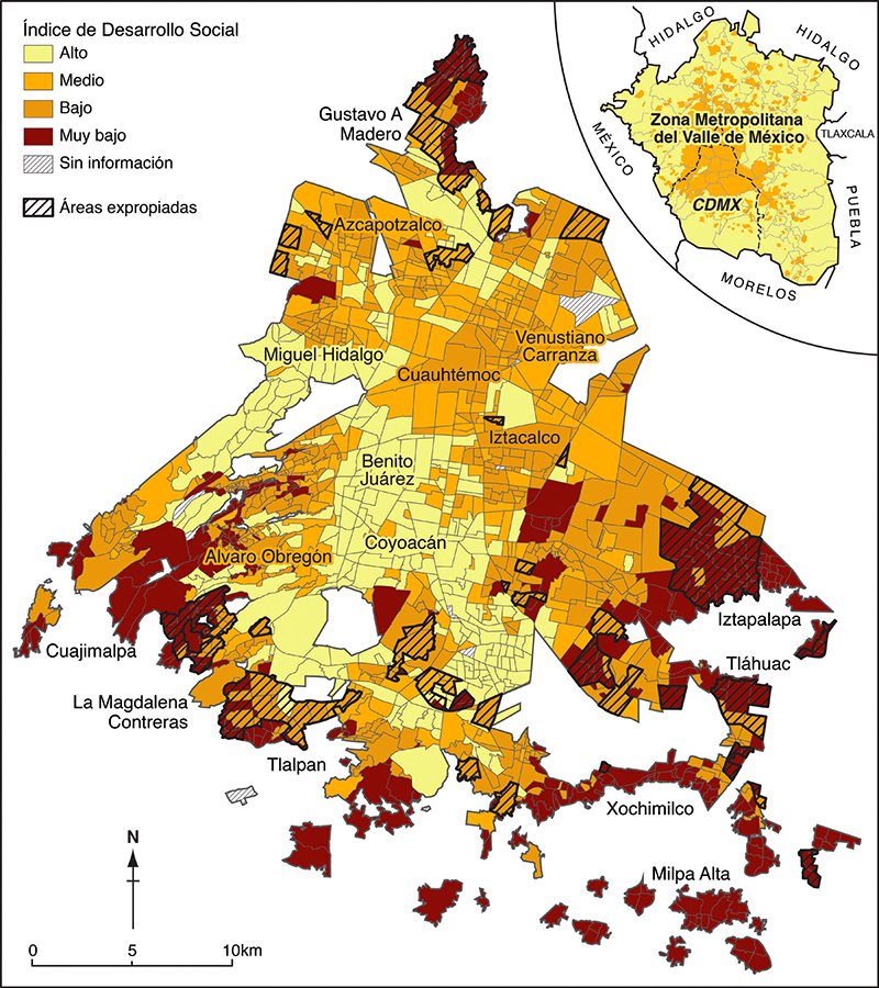 Las primeras expropiaciones para regularización se realizaron a finales de 1970, cuando se expropió una parte de las tierras a nueve ejidos del Estado de México para desarrollar proyectos de vivienda e industriales, así como para la regularización de la tenencia de asentamientos irregulares. En 1975, una de las primeras intervenciones de la CORETT fue la expropiación de tierras ejidales en el suroeste de la ciudad. Han pasado más de 45 años desde que la expropiación comenzó a ser utilizada para este propósito en la Ciudad de México, lo cual ofrece una oportunidad excepcional para observar las consecuencias a largo plazo. Otra oportunidad infrecuente se deriva de la elaboración por parte del gobierno del Distrito Federal de un índice de desarrollo social basado en microdatos censales disponibles a nivel de manzana para toda la superficie construida en 2005.
