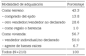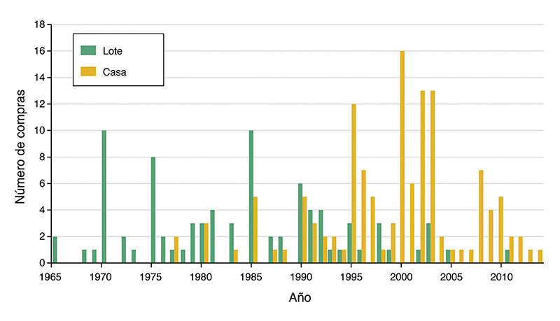 Estos cambios llevan el sello distintivo de la gentrificación, pero no significan que la regularización de la propiedad fuera la causa del desplazamiento. La Tabla 2 y la Figura 4 muestran cómo y cuándo fueron adquiridas las 210 propiedades ocupadas por propietarios encuestados. Dos de cada cinco fueron adquiridas como terreno: probablemente del ejido en la mayoría de los casos, lo que indica que los propietarios originales han resistido las presiones del mercado. Además, la Figura 4 no muestra un despunte en las ventas de vivienda después de la expropiación de 1980. Se presentó un aumento dramático mucho más tarde, lo cual posiblemente refleja la influencia de la política del Bando Dos en las delegaciones políticas periféricas. Estos resultados coinciden con los obtenidos anteriormente, que muestran que la tasa de cambio de propietario en el mercado de la vivienda sigue siendo baja después de la regularización (Varley, 2000; Ward, 2012).