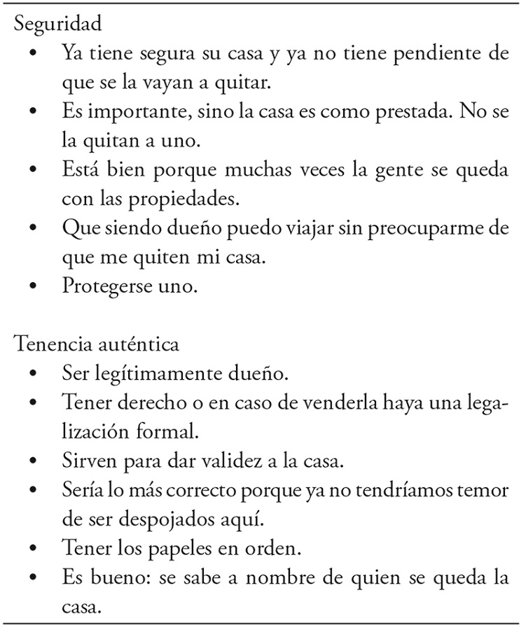 La otra razón principal para valorar la regularización de la propiedad es lo que podemos llamar “tenencia auténtica” (Figura 5). El título de propiedad otorga “valor” a la vivienda, pero no necesariamente un valor económico. En Los Encinos, Pancho comentó que “sin escrituras, no tiene valor la casa”, a lo cual alguien respondió “sí vale, si sabes que es tuya”. En San Mateo, Adolfo mencionó que “el que no tiene escrituras está construyendo en baldío”. Tener valor también significa “ser valiente”, y los participantes atribuyeron una dimensión moral al título de propiedad. Lo anterior se reflejó en comentarios acerca de “ser legítimamente dueño”, “tener derecho”, “sería lo más correcto”, e incluso se benefician de “una legalización formal”.