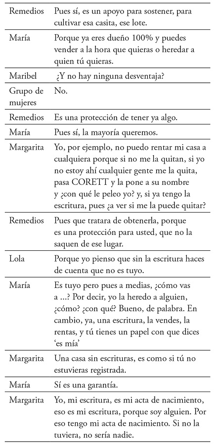 El hecho de que los residentes aceptaron gustosos la regularización de la propiedad fue evidente cuando pedí por primera vez sus opiniones en la década de 1980. Una frase muy repetida era “ya somos dueños”: la regularización confirmó la legitimidad de su propiedad. El mensaje nunca varió en las investigaciones subsecuentes; sin embargo, un estudio en Guadalajara a finales de la década de 1990 ofreció una oportunidad para explorar las razones de esta respuesta. El trabajo de campo incluyó dos encuestas sociales y grupos de discusión en cuatro colonias, dos de ellas en tierra ejidal: Los Encinos, un sentamiento creado hacía menos de 10 años, y San Mateo, que data de fines de los años cincuenta (se usan seudónimos). Una encuesta realizada entre mujeres propietarias y una sesión de discusión (con grupos de hombres y mujeres por separado) aportó los puntos de vista de los propietarios sobre la regularización de la propiedad. En San Mateo, la mayoría ya tenía escrituras, pero en Los Encinos todavía no se había realizado la regularización.