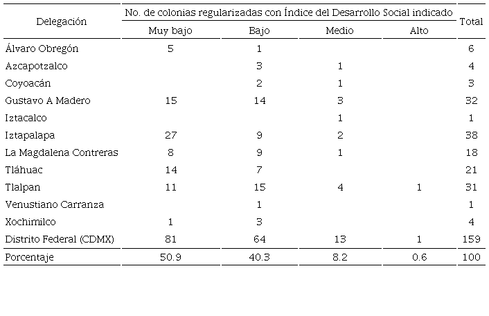 La clasificación de desarrollo social de las colonias expropiadas para regularización podría sugerir que los residentes originales han sido desplazados porque las colonias registran ahora valores correspondientes a áreas de clase media. Sin embargo, los resultados en la Tabla 1 y la Figura 1 muestran que casi todos (el 91%) las colonias regularizadas regularizadas caen en las categorías “muy baja” o “baja”, las cuales representan la mitad de todas las manzanas con viviendas en el Distrito Federal. Entonces, existen escasas evidencias que apuntan a que los resultados pudieran reflejar el arribo de nuevos residentes de la clase media como resultado de la gentrificación. Dado que el Distrito Federal es el núcleo de la Ciudad de México, con mayores niveles de desarrollo socioeconómico en general, parece poco probable que se obtuviera un resultado diferente si se realizara un ejercicio similar en el Estado de México.