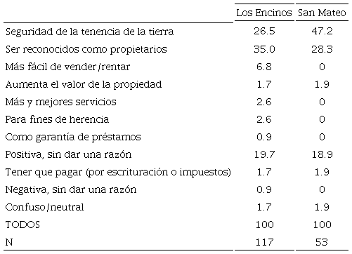 La mayoría de los encuestados considera que la regularización de la propiedad es un cambio favorable. Aunque muchos no dijeron por qué, el 27% de los encuestados en San Mateo y el 47% en Los Encinos mencionaron la seguridad de la tenencia de la tierra; el 35% y el 28%, respectivamente, mencionaron el reconocimiento como propietarios (Figura 5).