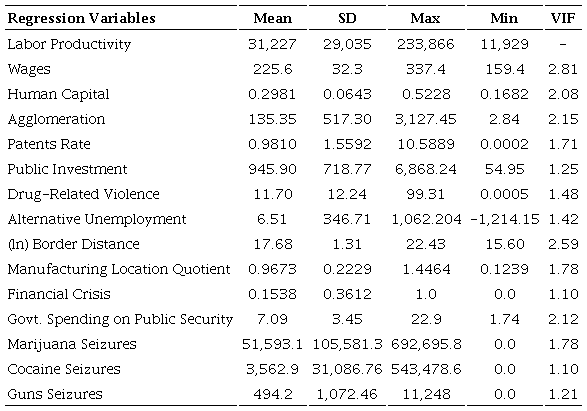Table A1 in Appendix 1 includes the expected signs, sources, and a brief description of each variable. Eq. (2) controls for regional characteristics that explain changes in labor productivity. Briefly, the dependent variable represents labor productivity or GDP per employed worker in state i. Wages are average daily wages reported to the Mexican Social Security Institute (IMSS). DRV stands for drug-related violence including the combined total of extortion, gun homicide, and kidnapping per 100,000 inhabitants. K is public investment related to physical infrastructure and service provision. HumanCapital considers the share of the workforce with at least high school diploma. Following the analysis of Gallaway et al. (1967) and Rappaport (2005), AltUnemp intends to capture the effect of labor mobility by estimating the difference of unemployment rate in state i and the weighted average distance of unemployment rates in the rest of the country except state i≠j. Agglomeration identifies employment density by considering the number of employed people per km2. Border variable considers the geographic proximity to the United States by calculating the GDP weighted by the distance between state i and the nearest U.S. port of entry. Following Acs et al. (2002), Buesa et al. (2010), and Wang et al. (2016), Patents intends to capture the effects of innovation on GDP per worker by considering the number of patents per 100,000 inhabitants. ManuLQ tries to capture location effects by including the employment location quotient of the secondary sector. FinancialCrisis is a dummy variable that captures the effect of the financial crisis during the 2008-2009 period. In specifying the AltUnemp and Border variables we calculate distances using the great circle distance. In order to eliminate or reduce simultaneity between the right side of Eq. (2) and the dependent variable we use a one-period lagged explanatory variables. Table 1 shows the descriptive statistics and variance inflation factors (VIF).