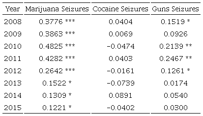 Our ESDA results indicate the presence of spatial patterns in the dataset, justifying the inclusion in our models of the spatial lag of both drug-related crimes and labor productivity. In terms of drug-related violence, global indicators of spatial association show a statistically significant increase of spatial clustering over time. Similarly, the Local Moran’s I of spatial association confirms the presence of local spatial patterns in GDP per worker employed and drug-related violence. Bivariate Moran’s I estimations indicate that law enforcement in a specific state, specifically marijuana and guns seizures, is associated with drug-related violence in neighboring states. These ESDA results validate the use of a first order spatial lag in the dependent variable and in drug-related violence. The spatial patterns of the relationship between illicit drugs enforcement and violent crimes rates confirms the necessity of using spatially lagged instrumental variables to address the endogeneity of drug-related violence, allowing testing for causality and reducing bias estimation.