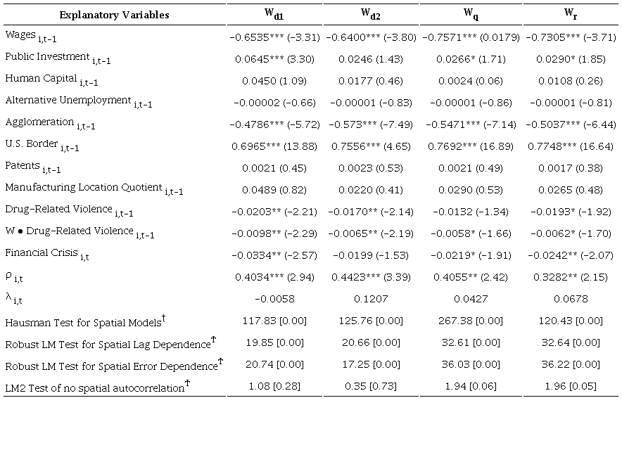 Table 4 shows the GMM spatial panel regression results. Briefly, average daily wages reported to Mexican social security are negative and highly statistically significant for all spatial weight matrices specifications. In our view, this result might be explained by a mismatch between an increasing labor force and stagnation in formal-sector occupation affecting productivity per worker. In a somewhat similar vein, Quinn and Rubb (2006: p. 148) examined the education-occupation matching on wages and productivity suggesting that “…in a country like Mexico we still find overeducated individuals because Mexico has a relative abundance of jobs that require low levels of education attainment” producing an adverse impact on wages and productivity. The spatial lag of GDP per worker (ρWY) shows statistically significant spillover effects indicating that growing productivity levels in neighboring states are positively related to productivity levels in a given state economy. Productivity levels appear to be explained by public investment rather than changes in wages. However, this result is not significant when considering the distance-based criterion Wd2. As expected, the distance from state i to the nearest U.S. port of entry plays a positive and statistically significant role in determining states’ GDP per worker, confirming the importance of location factors, especially for export-oriented industries (Jordaan, 2012). Mexico’s border states are strongly integrated to the business cycle of the U.S. economy particularly U.S. southern states (Phillips and Cañas, 2008).