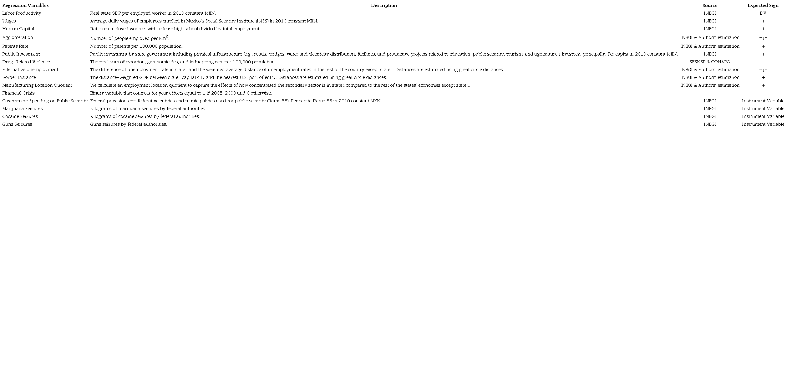 Abstract: This study examines the determinants of labor productivity for Mexico at the state level over the period 2003-2016 using annual data. The GMM technique is used to estimate a spatial panel data model that includes a spatial weight matrix (W), the spatial lag of the dependent variable (ρ), the spatially weighted average of lagged drug-related violence rate (θ), the spatial lag of the error term (λ), and adds instrumental variables to control for the endogeneity of drug-related violence. Our results indicate that drug-related violence exerts a negative and significant impact on labor productivity. Similarly, there is evidence of the negative spillover effects of drug-related crimes on regional GDP per worker. Public investment per capita has a highly significant effect on labor productivity while the impact of the 2008-2009 financial crisis was negative.