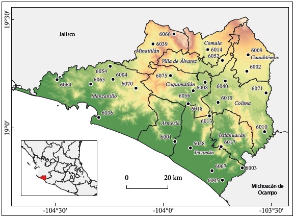 El estado de Colima se ubica en la porción occidental de México, entre los 18°41’ y 19°31’ de latitud norte y los 103°29’ y 104°41’ de longitud oeste (Figura 1). Posee una extensión territorial de alrededor de 5600 km2 y colinda con los estados de Michoacán de Ocampo y Jalisco. Posee una amplia línea de costa con el océano Pacífico de más de 150 km y una pendiente pronunciada que se eleva desde dicho océano hasta los 3800 msnm en la porción sur del volcán de Colima. Cuenta con un clima predominantemente cálido subhúmedo (86%), seco y semiseco (12.5%) y templado subhúmedo (1.5%) y una temperatura media anual de 25 °C con lluvias en verano (INEGI, 2021). Se identifican también tres subregiones desde un punto de vista espacial: zona norte (Comala y Cuauhtémoc), zona centro (Minatitlán, Villa de Álvarez, Coquimatlán, Colima y Ixtlahuacán) y zona sur (Manzanillo, Armería y Tecomán). El estado cuenta con 731 391 habitantes y 226 853 viviendas, de acuerdo con el último Censo Nacional de Población y Vivienda.