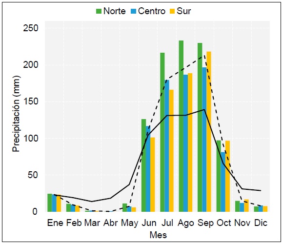 Pese a la limitada extensión territorial del estado se pueden observar diferencias significativas en la distribución de la precipitación por regiones (Figura 1 y Figura 2). La región norte prevalece como la más húmeda durante prácticamente todo el año. Lo anterior puede relacionarse con las características orográficas y uso de suelo, que permite la convección forzada y genera procesos de retroalimentación. Las diferencias observadas en un mismo mes entre la región norte con respecto a la centro y sur pueden ser de alrededor de 50 mm. Durante junio y julio la región centro prevalece con acumulados mayores con respecto a la región sur. En agosto el centro y sur tienden a igualarse, y posteriormente, en septiembre y octubre la región sur se alza con los mayores acumulados mensuales con respecto a la región centro. La transición observada del centro hacia sur puede relacionarse con el paso de ciclones tropicales y su mayor influencia sobre la costa en este mismo periodo.