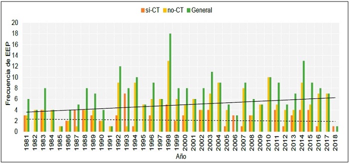 Al analizar las tendencias para los EEP sí-CT y no-CT, se puede observar cómo aquellos clasificados como no-CT poseen una ligera tendencia de incremento, caso contrario con aquellos etiqueta- dos como sí-CT. El incremento de la generación de eventos extremos de lluvia bajo escenarios de cambio climático ha sido ampliamente documentado. En este sentido, es probable que el forzamiento antropogénico termine provocando un aumento global de las precipitaciones extremas, debido principalmente al probable incremento del vapor de agua atmosférico y los entornos de inestabilidad asociados (Kunkel, 2003; Oliveira et al., 2017; Semmler y Jacob, 2004). Para el caso aquí presentado, las tendencias encontradas requieren ser contrastadas con series de tiempo más extensas que permitan conocer a profundidad los cambios en los patrones de precipitación y sus extremos.