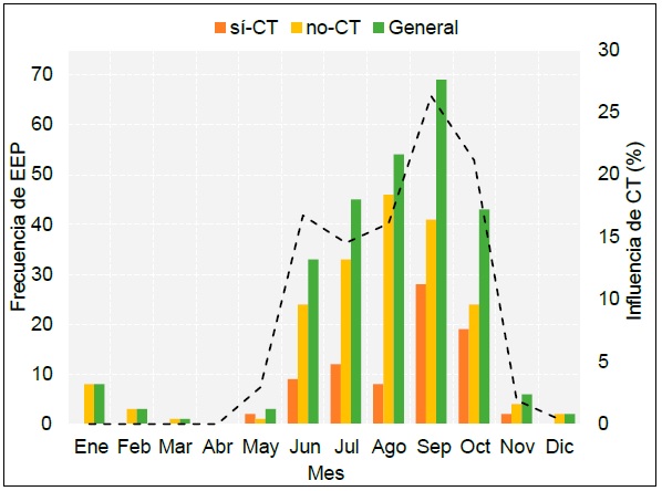 Los EEP sí-CT también comienzan a registrarse en junio, pero en una menor proporción que los no-CT. Su documentación incrementa durante el mes de julio y decrece en agosto. Dicho decremento puede relacionarse de alguna manera a la influencia de la canícula en esta parte de México (Magaña et al., 1999). Para el mes de septiembre los EEP sí-CT tienden a incrementarse significativamente, alcanzando su máximo de aparición y siendo coincidentes con la curva de influencia de los CT sobre el estado de Colima (Figura 5). En otras palabras, una mayor influencia de CT sobre la zona de estudio induce una mayor probabilidad de generación de un evento extremo. En octubre disminuye gradualmente el número de eventos registrados, y para el periodo entre diciembre y abril estos con valores nulos. Es importante mencionar que para este análisis se consideraron todos aquellos CT con influencia sobre el territorio colimense y no únicamente aquellos que lograron impactar la región continental.