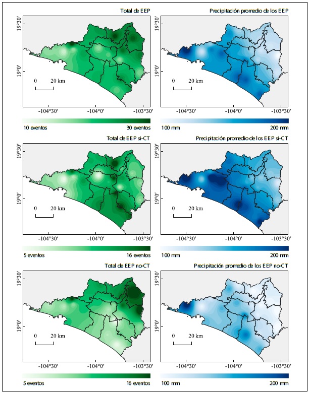 La Figura 6 muestra la distribución espacial del número total de EEP, así como su desglose por tipo (sí-CT y no-CT), y el promedio de la precipitación asociada. Se puede observar que la frecuencia de EEP en la región norte puede ser del doble en comparación con la región sur del estado (Figura 6, fila superior). En este sentido, el gradiente topográfico y las formas del terreno parecen determinar en buena medida la distribución de los EEP en el estado. También se puede identificar al norte del municipio de Manzanillo con frecuencias superiores a los 30 EEP. Esta zona es coincidente con el cerro La Espumilla, lo que revela nuevamente la importancia de la orografía en la generación de estos eventos a través de procesos de convección profunda y forzada por el terreno.