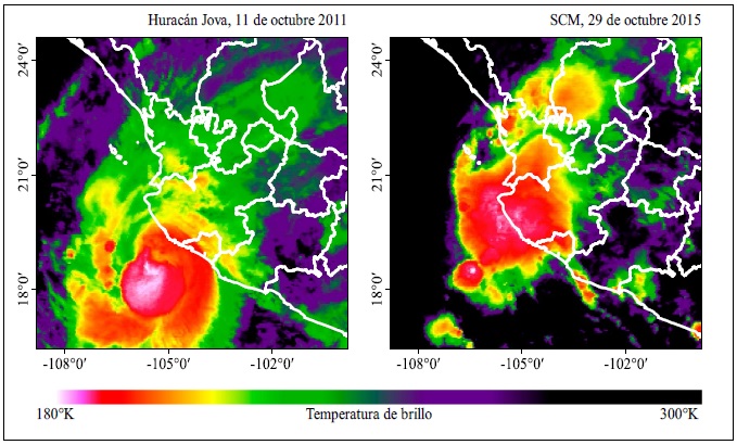 De manera general (Figura 7) se puede observar cómo los EEP sí-CT poseen los acumulados superiores con alrededor de 170 mm en promedio. Los extremos inferior y superior para estos eventos oscilan entre los 70 mm y 340 mm. Los casos considerados como atípicos superan incluso los 400 mm de lluvia diaria y representan los casos más extremos. En este sentido, se puede identificar a la Depresión Tropical y posterior Tormenta Tropical “Greg”, que afectó al territorio colimense el 5-6 de septiembre de 1999 (EEP identificado con 400.1 mm) y al Huracán “Jova” (Figura 8), que alcanzó una categorización de 3 en la Escala Saffir-Simpson y afectó el territorio entre el 10-12 de octubre de 2011 (EEP identificado con 404.5 mm). Estos dos eventos extremos representan los históricos acumulados para el estado de Colima y son un ejemplo claro del peligro que representan para la población de la región. Es importante mencionar que para ambos casos fueron emitidas declaratorias de desastre por parte del CENAPRED.2